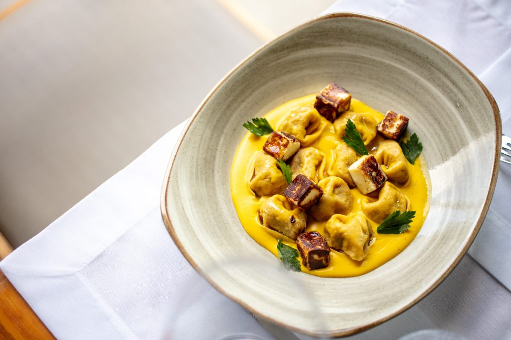 Nhoque de banana-da-terra dourado com costelinha de leitoa desfiada e lardo de colonata (R$ 69); o Agnolotti, uma massa fresca recheada com polenta e brie, ragu de galinha d’angola e crocante de quiabo (R$ 67); Polvo braseado com cebola pérola e musseline de baroa com pequi (R$ 84); e a Barriga suína do do Tizzi marinada com cachaça, melaço de cana e creme de milho trufado (R$ 83), são também opções da nova casa.