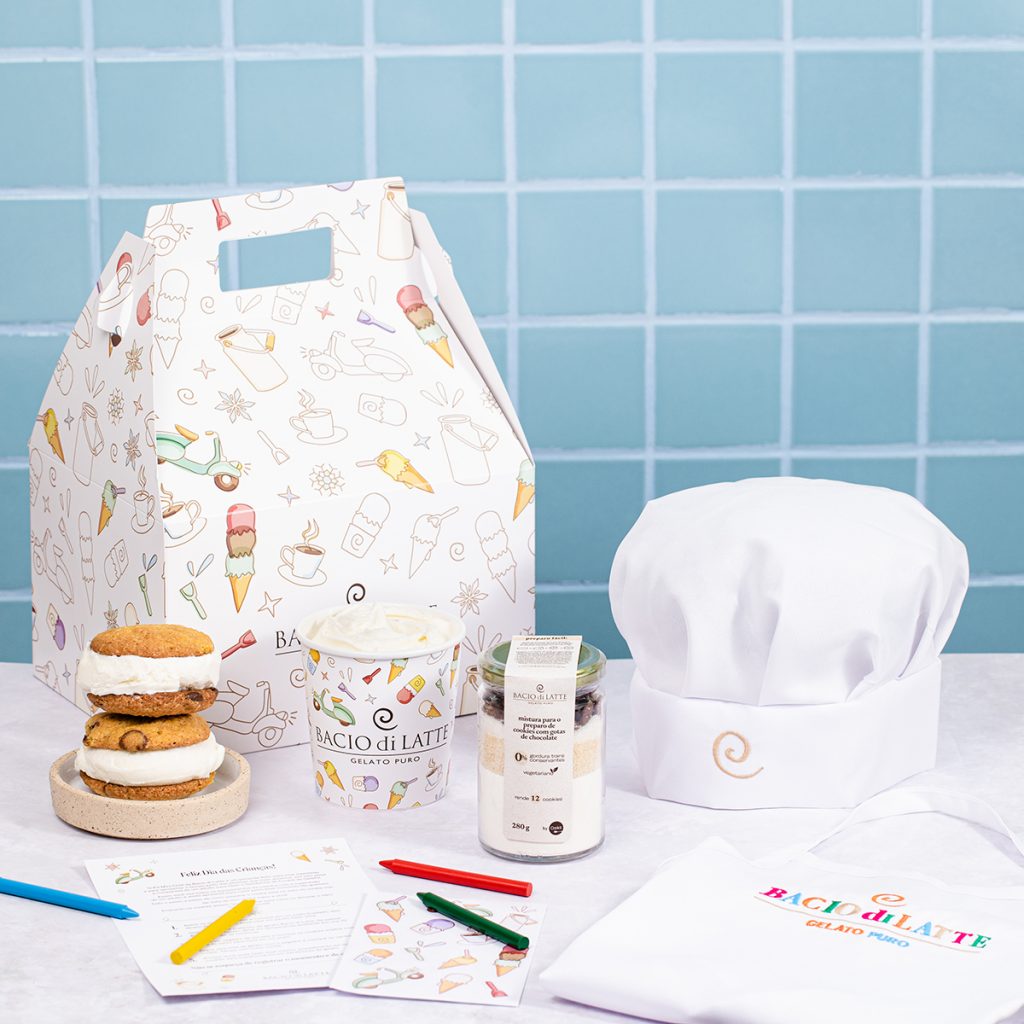 O Kit Mini Chef da Bacio di Latte possui ingredientes especiais para a preparação de um sanduíche de cookies com recheio de gelato, além de acompanhar um avental e chapéu de cozinheiro para proporcionar uma experiência completa de um chef de cozinha. “Queremos que os momentos que envolvem a vivência na culinária entre os adultos e crianças sejam memórias especiais que marquem a vida de nossos clientes”, afirma Fábio Medeiros, diretor de marketing da Bacio di Latte.