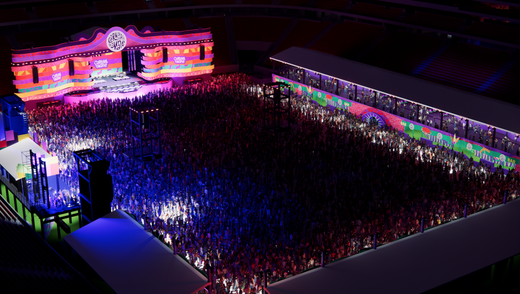 “O conceito nasceu da energia que essa época transmite, traduzida em elementos visuais. O palco é o ponto central, com uma estrutura que “explode” em direção ao público. Com o uso de luzes, ele se torna parte viva da festa. As formas orgânicas trazem traços de nossa arquitetura moderna, reforçando a identidade brasiliense”, explica Ana Carolina Falconi, sócia do Studio Traços, que assina a arquitetura do evento.
