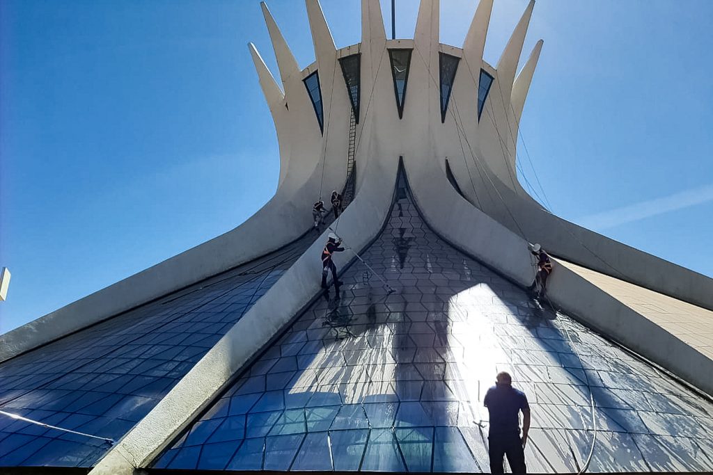 Mais de 24 mil litros d’água e o empenho de oito homens, parte deles especialista em rapel, foram empenhados na lavagem dos vitrais da Catedral Metropolitana de Brasília. Um dos símbolos postais mais visitados da cidade, a igreja projetada por Oscar Niemeyer completou 50 anos em 2020 e é mais um dos edifícios monumentais que passam por um processo de limpeza das suas estruturas.