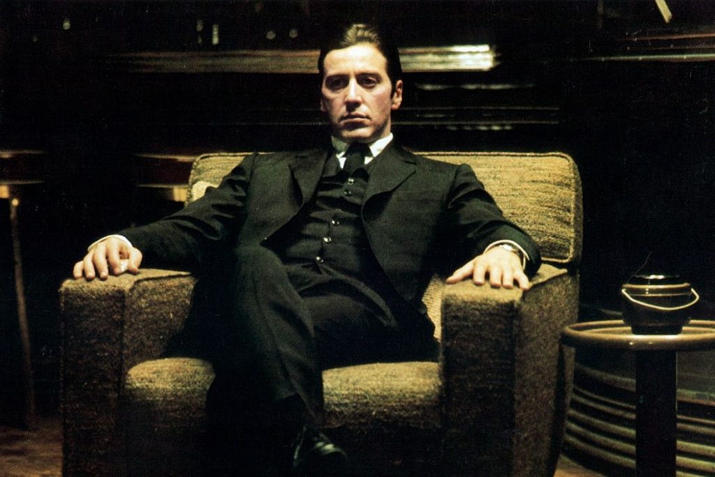 Vindo do teatro e chegando ao cinema recém-formado pela antológica escola de atuação moderna do Actors Studio (como quase todos de sua geração, a da Nova Hollywood), Pacino, já em 1971, chamaria a atenção em “Os Viciados”, de Jerry Schatzberg. Os olhos extremamente expressivos e o gestual que traziam algo “de dentro” serviram a um dos mais antológicos personagens da história do cinema, o atormentado, violento e fragilizado Michael Corleone de “O Poderoso Chefão”, de Francis Ford Coppola, a trilogia mais célebre da história do cinema).