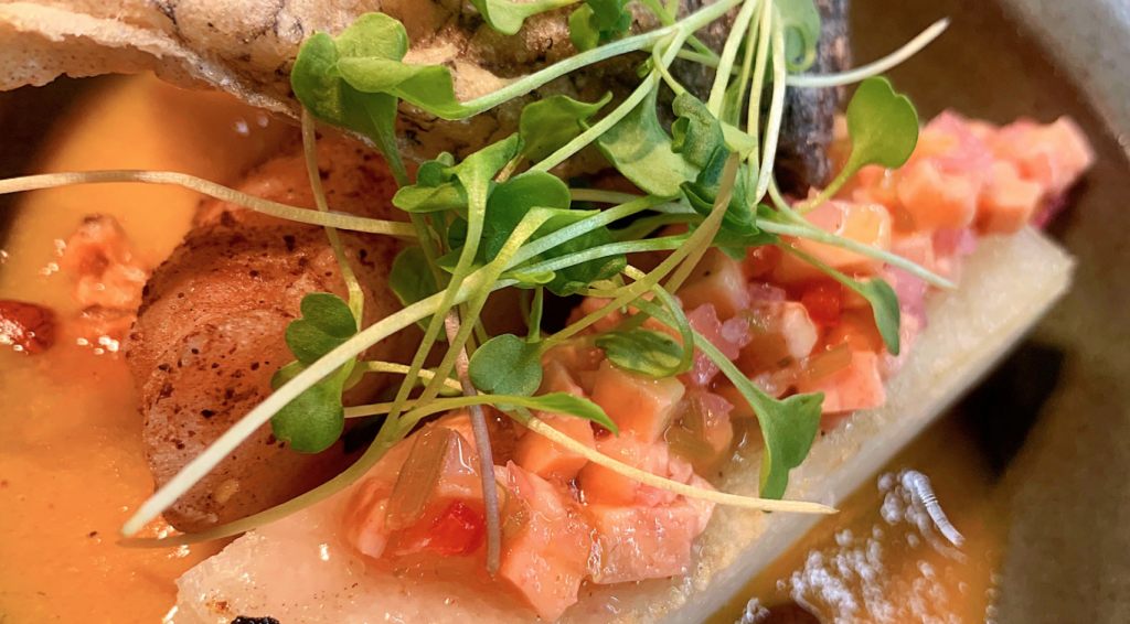 Para começar, Focaccia de tomate fermentado, cenoura, castanha de pequi e mangaba. Nos pratos principais, ‘Cordeiro acompanhado de arroz, garam massala, coalhada, menta e dill’; ‘Bao recheado com alho negro, língua de boi, kimchi de cebolinha e maracujá pérola’; ‘Tortilla com pernil suíno, hoisin amendoim e coentro’; Moqueca de peixe-peixe, arroz, licuri, dendê, leite de coco e banana da terra e Cupim acompanhado de canjiquinha e ora pro nobis. De sobremesa, Ambrosia feita com limão cravo, especiarias brasileiras, laranja bahia, missô e mel.