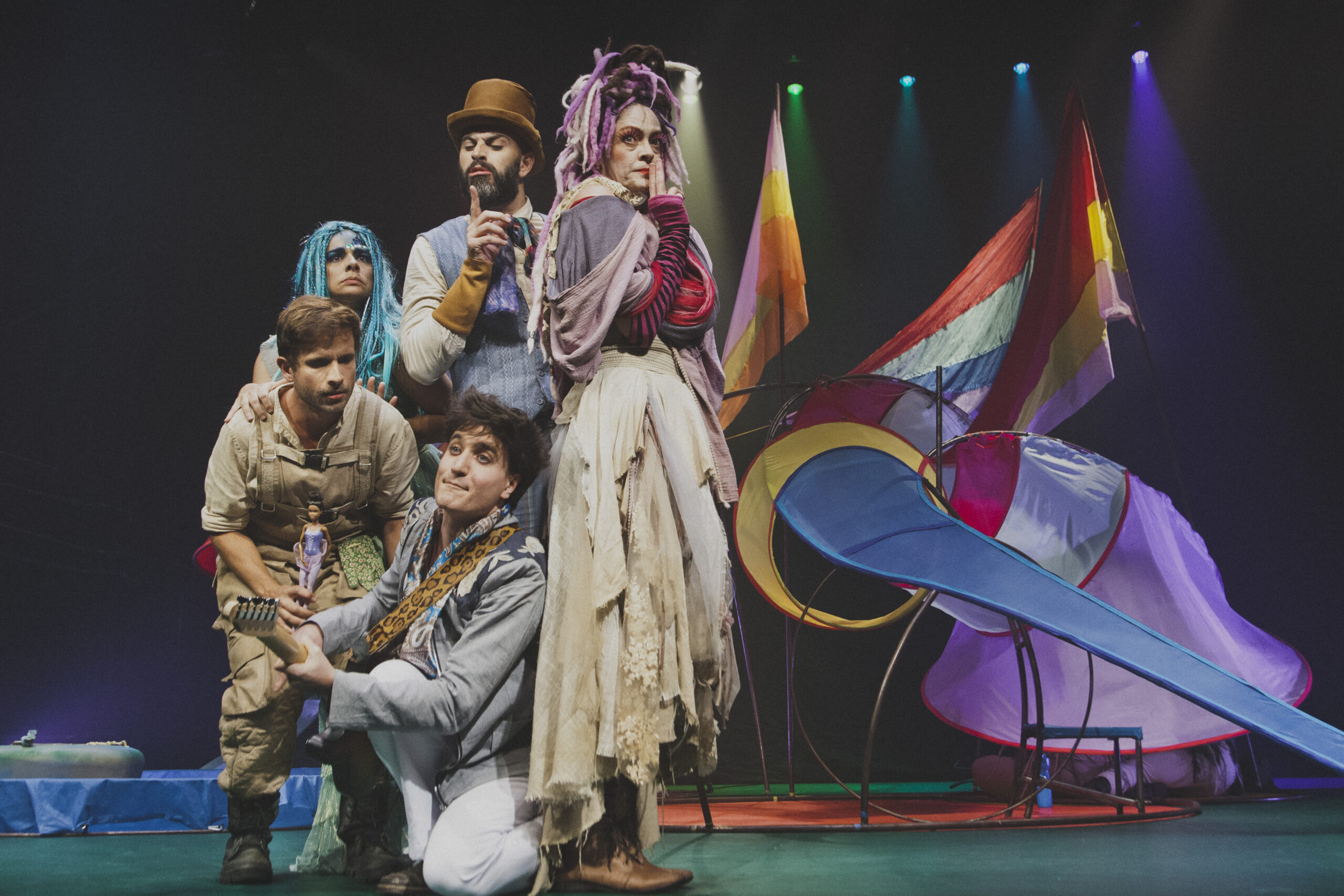 O cenário interativo, criado por Sérgio Marimba, é composto por uma grande estrutura de ferro flexível, que dialoga com a iluminação de Aurélio de Simoni e os figurinos de Danielly Ramos. O espaço convida as crianças a mergulharem em um universo lúdico e colorido, permitindo que os atores se movimentem livremente pelo cenário.