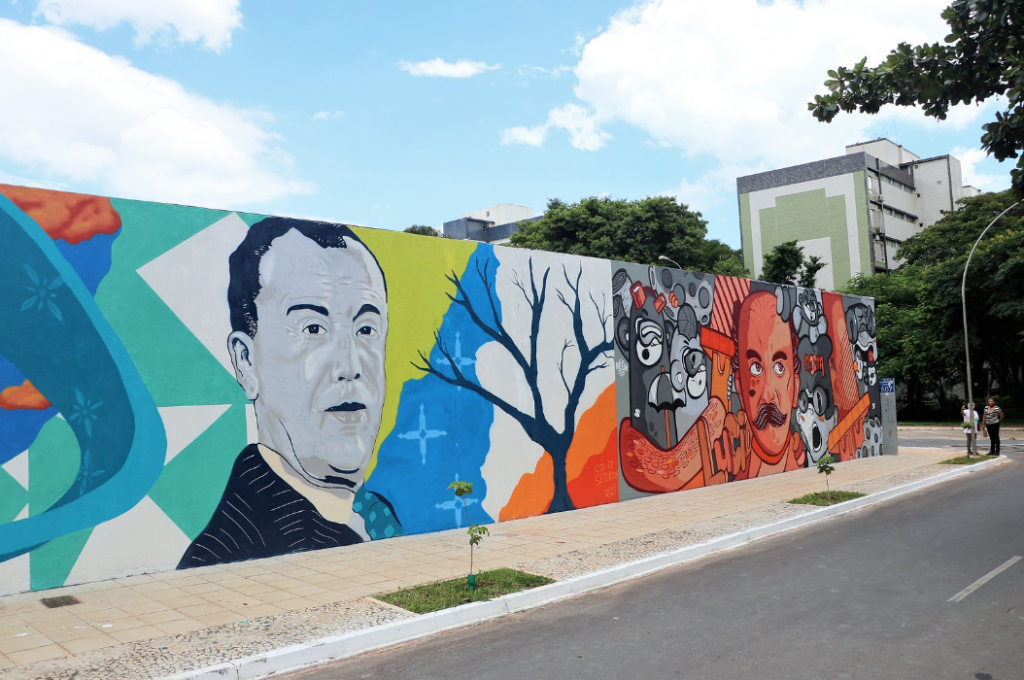 No painel inaugurado nesta segunda (20), estão representados o fundador da capital, Juscelino Kubitschek, o arquiteto Oscar Niemeyer, o urbanista Lúcio Costa, o paisagista Burle Marx e os artistas plásticos Athos Bulcão e Marianne Peretti. Nos painéis laterais inferior e frontais do prédio, vários artistas fizeram uma releitura com ilustrações dos homenageados, entre elas as artistas de rua Didi Colado e Key Amorim.