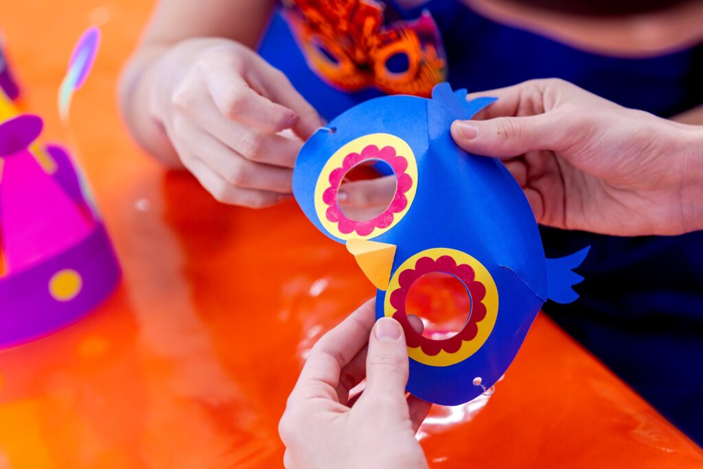 As crianças criam suas próprias máscaras e adereços carnavalescos, explorando cores, formas e personagens. Mais do que pensar um pequeno projeto, a criação dos enfeites convida o folião a soltar a imaginação e embarcar na irreverência da festa popular.