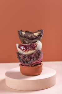 Dentre as opções na casca de chocolate preto estão brownie com brigadeiro (feito à base de leite de coco),  brownie com ganache de chocolate branco, Prestígio (com recheio de bolo de chocolate e cocada, decorado com beijinhos), Ferrero Rocher (recheado com creme de chocolate e avelã, intercalado com biscoito champagne, finalizado com bombons tipo Ferrero Rocher),  dois chocolates (com recheio de brigadeiro de leite de coco e ganache de chocolate branco, decorado com morangos banhados no chocolate) e duas sugestões veganas: brigadeiro (com brigadeiro de leite de coco, decorado com brigadeiros) e brigadeiro com morangos (recheado com brigadeiro de leite de coco, decorado com morangos banhados no chocolate e brigadeiro).