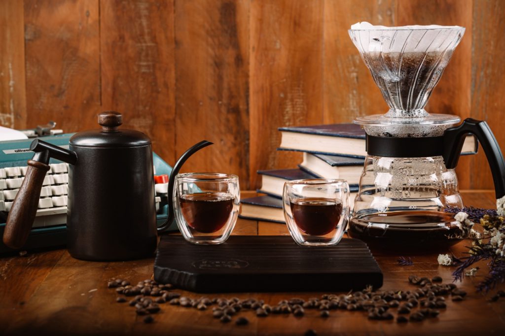 O primeiro, Hario V60, é conhecido por ser um método japonês bastante utilizado. Por meio de um coador de cerâmica ou vidro, em formato espiral, a temperatura da água se mantém elevada e o fluxo da água se torna mais uniforme. O consumo é indicado para os fãs do café coado que desejam ressaltar notas sensoriais e aromáticas do grão.