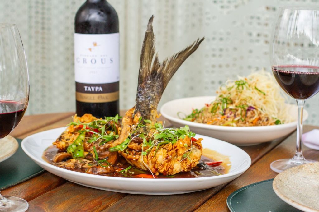 A primeira sugestão é o Camarão Pistola na Brasa, com molho de pimenta amarela e ravióli de palmito, R$135,00. A segunda opção é o Peixe Entero (com molho de nikkei de mix de cogumelos e arroz ao wok com vegetais), que serve de duas a três pessoas ao valor de R$235,00.