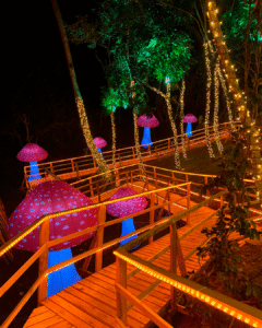 Instalado em uma área de 4.400 m², em Taguatinga, o Vale Encantado Brasília contará com 1.500 m² dedicados à cenografia, criando um ambiente que combina espécies vegetais reais e iluminação técnica de alta precisão. São 150 árvores mapeadas de diferentes espécies, como ipês, pau-brasil, jatobás, guapuruvus e araucárias, além de 10 mil flores iluminadas e microlâmpadas que darão vida ao espaço.